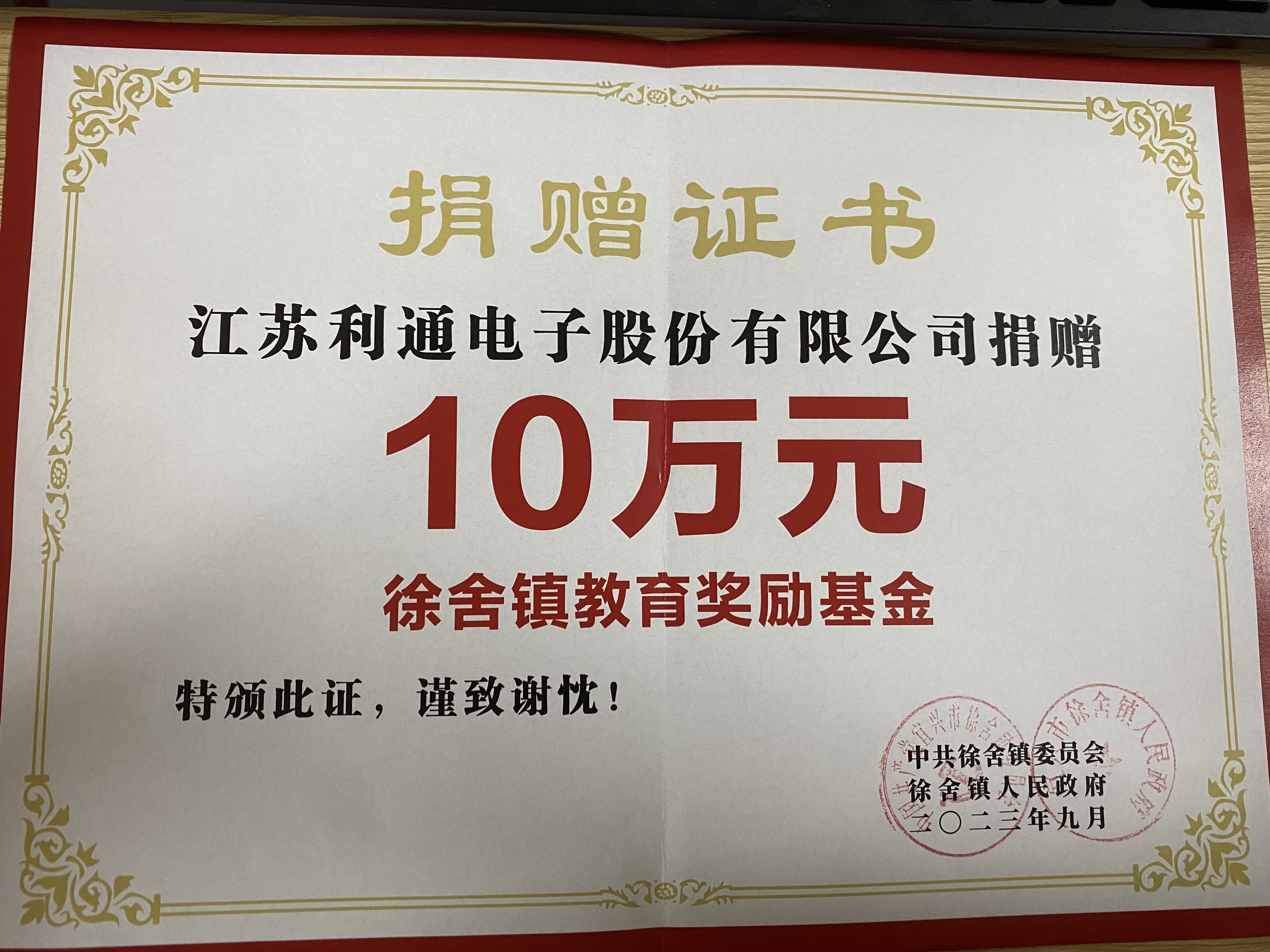 2023年9月8日上午,徐舍鎮(zhèn)隆重召開慶祝第三十九個(gè)教師節(jié)暨2023年度教育工作會議。利通電子認(rèn)捐10萬元,支持徐舍鎮(zhèn)教育事業(yè)的高質(zhì)量發(fā)展。我司作為慈善捐贈(zèng)愛心企業(yè)受邀參加此次會議。利通一直樹立以人為本的企業(yè)文化,在關(guān)注自身發(fā)展的同時(shí),也用實(shí)際行動(dòng)踐行著企業(yè)的社會責(zé)任,積極倡導(dǎo)愛心公益,情系教育,心系發(fā)展,為教育事業(yè)貢獻(xiàn)自己的一份力量。